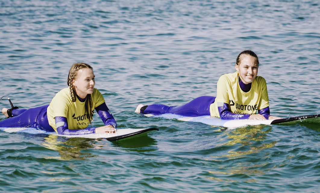 Profis am Werk: Das DPC Duotone Pro Center stellt nicht nur die coolsten Coaches, sondern auch das Material. Du kriegst einen schicken Neo, der alles an der richtigen Stelle hält, und ein Board, das Fehler verzeiht.